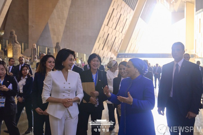 [서울=뉴스핌] 김혜경 여사와 이집트 영부인 인테사르 엘시시 여사가 지난 20일(현지시간) 이집트 대박물관을 함께 방문해 대화를 나누며 이동하고 있다. [사진=대통령실] 2025.11.22photo@newspim.com