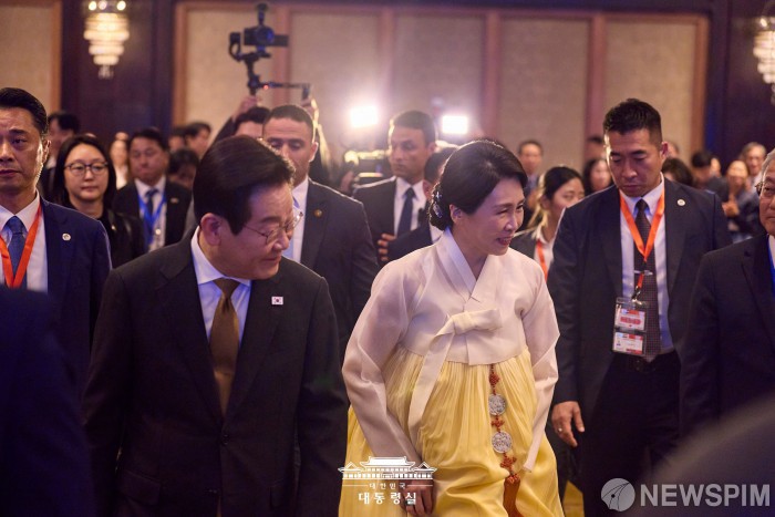 [서울=뉴스핌] 이재명 대통령과 김혜경 여사가 지난 20일(현지시간) 이집트 수도 카이로 한 호텔에서 열린 동포·지상사 간담회에 참석하고 있다. [사진=대통령실] 2025.11.22 photo@newspim.com