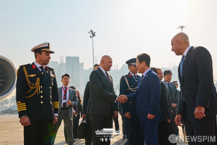 [서울=뉴스핌] 이집트 공식 방문을 마친 이재명 대통령이 지난 21일(현지시간) 남아공 주요 20개국(G20) 정상회의 참석을 위해 카이로 국제공항에서 공군 1호기로 이동하며 인사를 나누고 있다. [사진=대통령실] 2025.11.22 photo@newspim.com