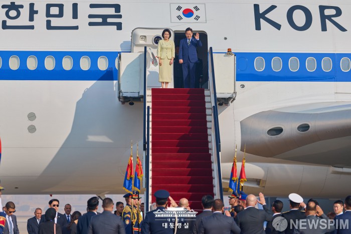 [서울=뉴스핌] 이집트 공식 방문을 마친 이재명 대통령과 김혜경 여사가 지난 21일(현지시간) 남아공 주요 20개국(G20) 정상회의 참석을 위해 카이로 국제공항에서 공군 1호기에 올라 인사하고 있다. [사진=대통령실] 2025.11.22 photo@newspim.com