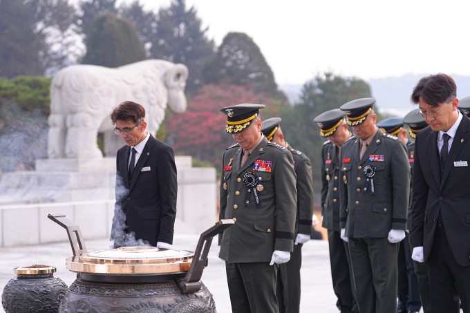 | 23일 대전 현충원에서 개최된 제15주년 연평도포격전 전투영웅 추모 및 전승기념행사에 앞서 주일석 해병대사령관이 대전현충원 현충탑을 참배하고 있다. [사진=해병대사령부 제공] 2025.11.23 gomsi@newspim.com |