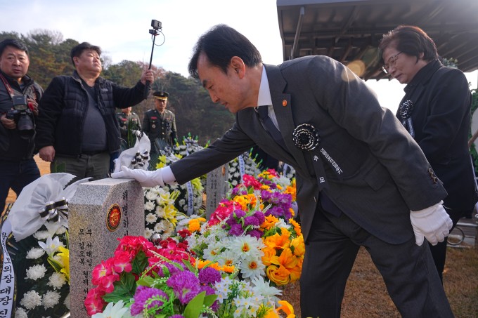| 대전현충원에서 개최된 제15주년 연평도포격전 전투영웅 추모 및 전승기념행사에서 안규백 국방부장관이 고 서정우 하사 묘비를 쓰다듬고 있다. [사진=해병대사령부 제공] 2025.11.23 gomsi@newspim.com |