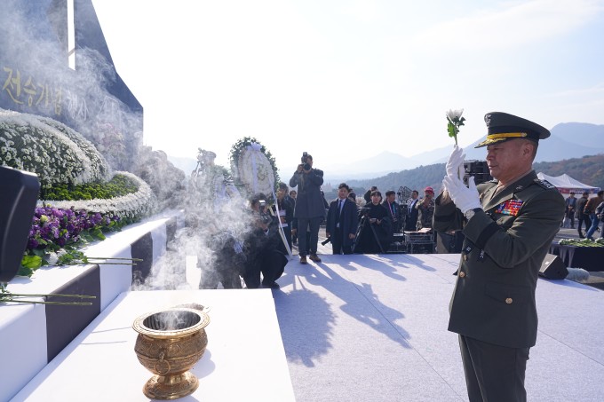 | 23일 대전 현충원에서 개최된 제15주년 연평도포격전 전투영웅 추모 및 전승기념행사에서 주일석 해병대사령관이 헌화 및 분향을 하고 있다. [사진=해병대사령부 제공] 2025.11.23 gomsi@newspim.com |