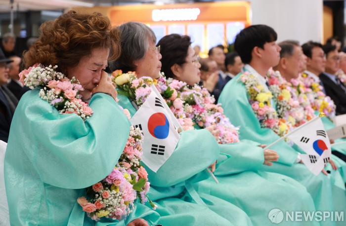 [서울=뉴스핌] 김학선 기자 = 23일 서울 강서구 김포공항 국제선 청사 입국장에서 열린 '대한민국임시정부 요인 환국 재현' 행사에서 임시정부 요인 후손이 눈물을 흘리고 있다. 2025.11.23 yooksa@newspim.com
