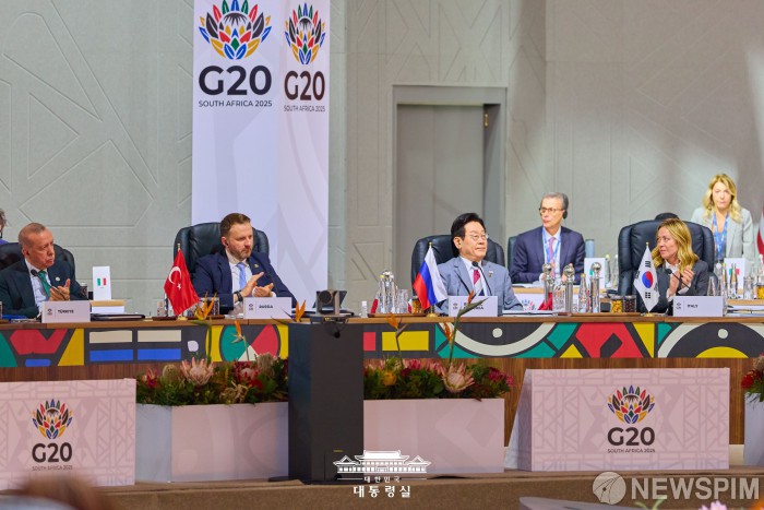 [서울=뉴스핌] 이재명 대통령이 지난 22일(현지시간) 남아프리카공화국 요하네스버그에서 열린 주요 20개국(G20) 정상회의 1세션에서 모두발언을 마치고 박수를 받고 있다. [사진=대통령실] 2025.11.23 photo@newspim.com