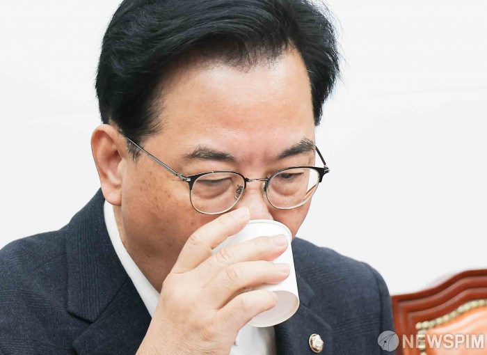 [서울=뉴스핌] 윤창빈 기자 = 송언석 국민의힘 원내대표가 24일 서울 여의도 국회에서 열린 최고위원회의에서 물을 마시고 있다. 2025.11.24 pangbin@newspim.com