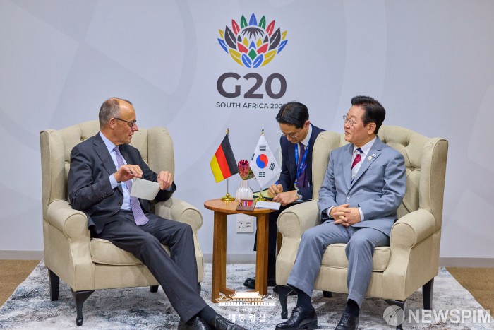 [서울=뉴스핌] 이재명 대통령과 프리드리히 메르츠 독일 총리가 22일(현지시간) 오후 남아프리카공화국 요하네스버그에서 개최된 주요 20개국(G20) 정상회의 참석을 계기로 정상회담을 하고 있다. [사진=대통령실] 2025.11.24 photo@newspim.com