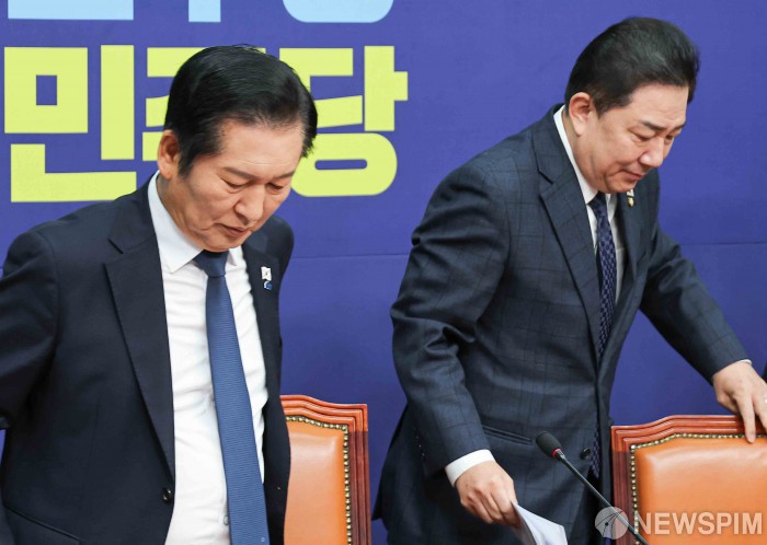 [서울=뉴스핌] 윤창빈 기자 = 정청래 더불어민주당 대표, 김병기 원내대표가 24일 서울 여의도 국회에서 열린 최고위원회의에 참석하고 있다. 2025.11.24 pangbin@newspim.com