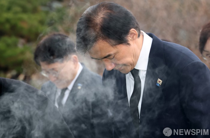 [서울=뉴스핌] 최지환 기자 = 신임 대표로 선출된 조국 조국혁신당 대표가 24일 오전 서울 동작구 국립서울현충원을 찾아 참배하고 있다. 2025.11.24 choipix16@newspim.com