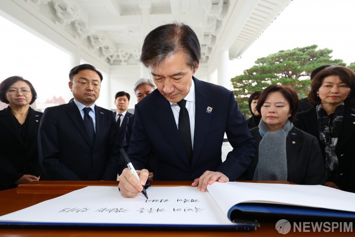 [서울=뉴스핌] 최지환 기자 = 신임 대표로 선출된 조국 조국혁신당 대표가 24일 오전 서울 동작구 국립서울현충원 현충탑을 참배한 후 방명록을 작성하고 있다. 2025.11.24 choipix16@newspim.com