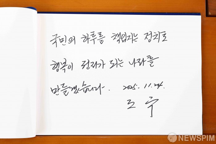 [서울=뉴스핌] 최지환 기자 = 조국 조국혁신당 신임 대표가 24일 오전 서울 동작구 국립서울현충원 현충탑을 참배한 뒤 작성한 방명록. '국민의 하루를 책임지는 정치로 행복이 권리가 되는 나라를 만들겠습니다'라고 적었다. 2025.11.24 choipix16@newspim.com