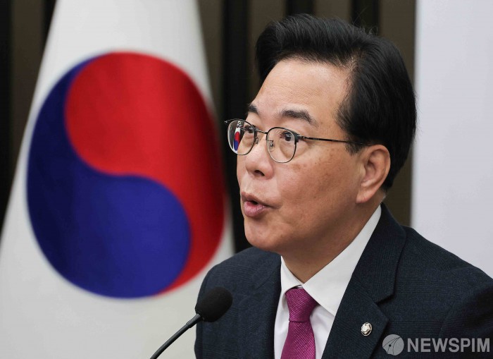 [서울=뉴스핌] 윤창빈 기자 = 송언석 국민의힘 원내대표가 24일 서울 여의도 국회에서 열린 의원총회에서 모두발언을 하고 있다. 2025.11.24 pangbin@newspim.com