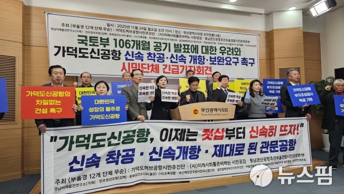 [부산=뉴스핌] 남동현 기자 = 부울경시민단체들이 가덕도신공항 개발사업이 기존 84개월에서 106개월로 공사 기간이 늘어난 가운데 신속 개항을 촉구했다.