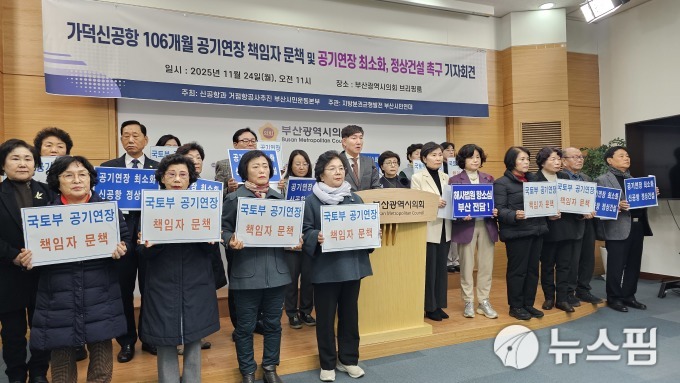 | [부산=뉴스핌] 남동현 기자 = 부산시민단체들이 오전 11시 부산시의회 3층 브리핑룸에서 기자회견을 열고 가덕신공항 부지조성 공사 기간의 연장을 한 책임자를 문책할 것을 촉구하고 있다. 2025.11.24 |