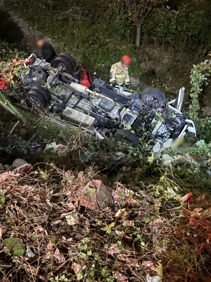 [부산=뉴스핌] 남동현 기자 = 23일 오후 10시 25분경 부산 기장읍 한 도로에서 A(50대)씨가 몰던 화물차량이 신호대기 SUV차량을 추돌한 뒤 약 7m 아래로 추락해 전복됐다.