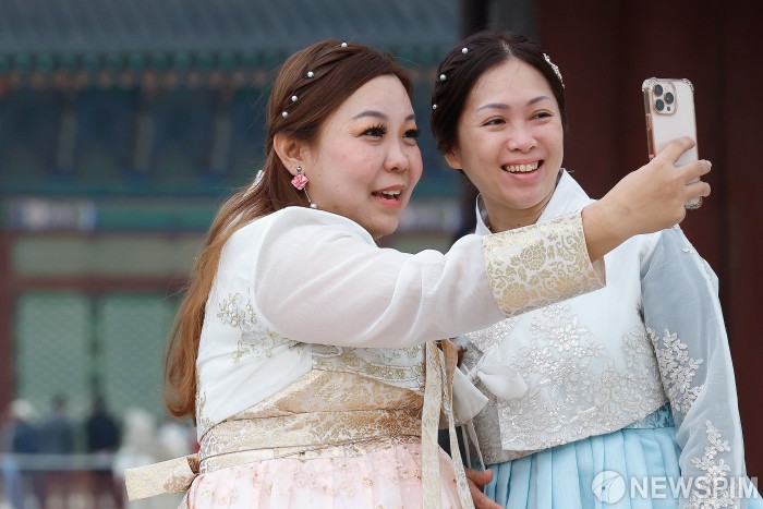 [서울=뉴스핌] 류기찬 기자 = 중일 갈등으로 중국 정부가 자국민에게 일본 여행·유학 등 자제령을 내리면서 한국이 대체 여행지로 각광 받고 있는 24일 오전 서울 종로구 경복궁에서 중국인 관광객들이 기념촬영을 하고 있다. 2025.11.24 ryuchan0925@newspim.com