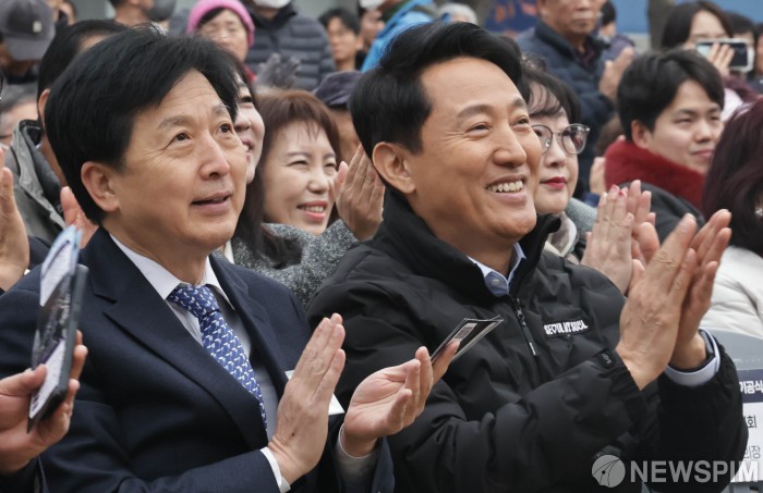 [서울=뉴스핌] 양윤모 기자 = 오세훈 서울시장이 24일 오전 서울 도봉구 방학동 방학사계광장 여름마당에서 개최된 '우이신설 연장선 기공식'에 참석 오기형 더불어민주당 국회의원과 박수를 보내고 있다. 우이신설 연장선 사업은 2032년 개통을 목표로 솔밭공원역에서 1호선 방학역까지 총 3.93km, 3개 정거장 신설을 목표로 총사업비 4,690억 원이 투입되는 도봉구 방학·쌍문 지역의 교통 편의 증진과 지역 발전을 위한 대형 교통망 사업으로 시공사는 ‘HL디앤아이한라 컨소시엄’이다. 행사에는 오세훈 서울시장,최호정 서울시의회 의장,오언석 도봉구청장,오기형 더불어민주당 국회의원 등이 참석했다. 2025.11.24 yym58@newspim.com