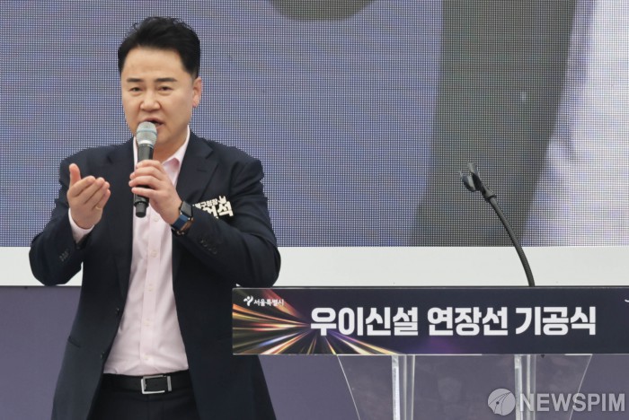 [서울=뉴스핌] 양윤모 기자 = 오언석 도봉구청장이 24일 오전 서울 도봉구 방학동 방학사계광장 여름마당에서 개최된 '우이신설 연장선 기공식'에 참석 축사를 하고 있다. 우이신설 연장선 사업은 2032년 개통을 목표로 솔밭공원역에서 1호선 방학역까지 총 3.93km, 3개 정거장 신설을 목표로 총사업비 4,690억 원이 투입되는 도봉구 방학·쌍문 지역의 교통 편의 증진과 지역 발전을 위한 대형 교통망 사업으로 시공사는 ‘HL디앤아이한라 컨소시엄’이다. 행사에는 오세훈 서울시장,최호정 서울시의회 의장,오언석 도봉구청장,오기형 더불어민주당 국회의원 등이 참석했다. 2025.11.24 yym58@newspim.com