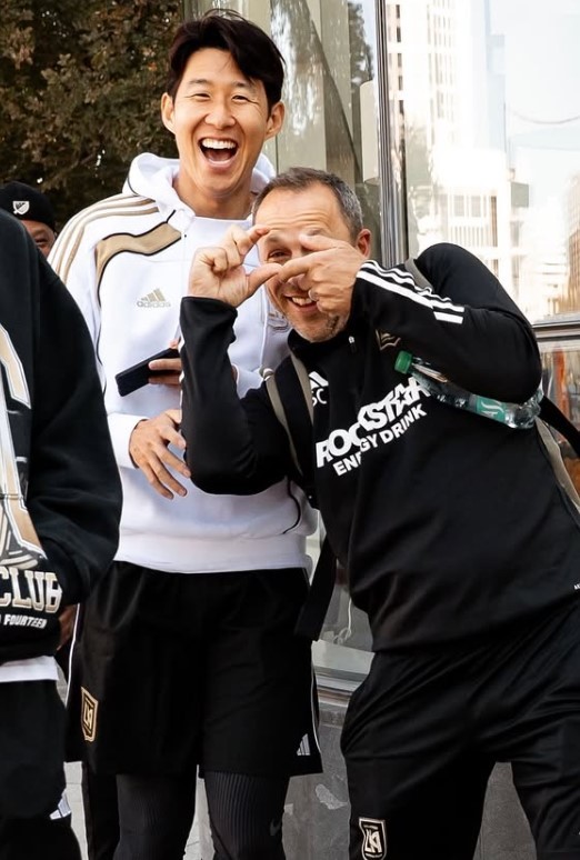 | 손흥민(왼쪽)과 찰칵 세리머니를 흉내내는 스티브 체룬돌로 감독. [사진=LAFC] |