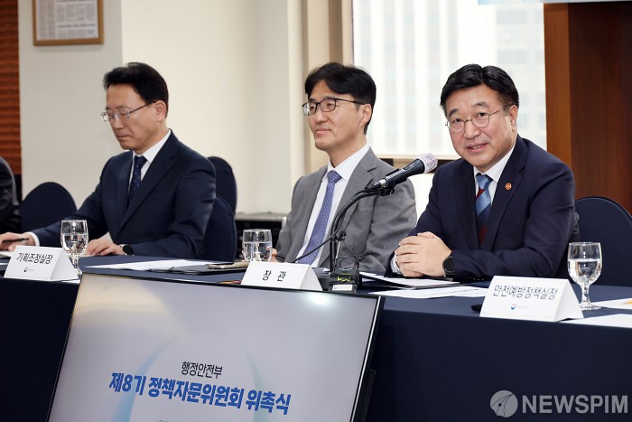 [서울=뉴스핌] = 윤호중 행정안전부 장관이 24일 서울 중구 한국프레스센터에서 열린 제8기 정책자문위원회 위촉식 및 첫 회의에 참석해 인사말을 하고 있다. [사진=행정안전부] 2025.11.24 photo@newspim.com