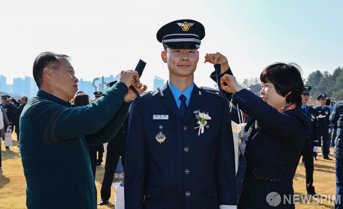 [서울=뉴스핌] = 24일 경남 진주시 공군교육사령부 대연병장에서 열린 제155기 공군 학사사관후보생 임관식에서 가족들이 신임 소위에게 계급장을 달아주고 있다. [사진=공군] 2025.11.24 photo@newspim.com