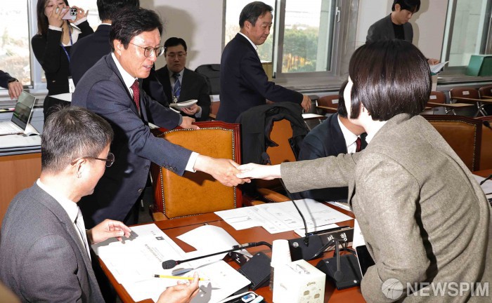 [서울=뉴스핌] 윤창빈 기자 = 박형수 예산소위 국민의힘 간사, 이소영 더불어민주당 간사가 17일 오전 서울 여의도 국회에서 열린 예산결산특별위원회 제1차 예산안등조정소위원회에서 악수하고 있다. 2025.11.17 pangbin@newspim.com