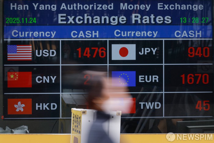 [서울=뉴스핌] 류기찬 기자 = 달러/원 환율이 1470원을 돌파한 24일 오후 서울 중구 명동 환전소에 달러/원 환전 시세가 표시되고 있다. 2025.11.24 ryuchan0925@newspim.com