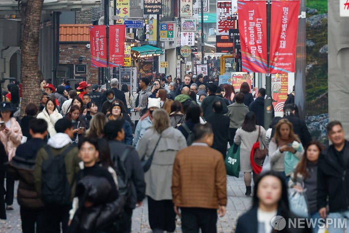 [서울=뉴스핌] 류기찬 기자 = 중국과 일본의 갈등으로 중국 정부가 자국민에게 일본 여행과 유학 등 방문 자제령을 내리면서 한국이 대체 여행지로 각광 받고 있다. 24일 오후 서울 중구 명동거리가 관광객들로 붐비고 있다. 2025.11.24 ryuchan0925@newspim.com