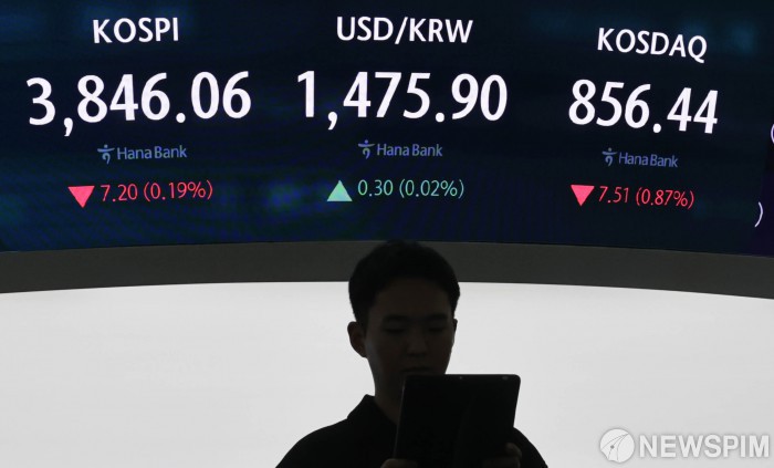 [서울=뉴스핌] 양윤모 기자 = 24일 오후 코스피가 전장 종가보다 7.20 포인트(0.19%) 하락하며 3846.06으로, 코스닥은 7.51 포인트(0.87%) 하락한 856.44로 장을 마감한 가운데, 서울 중구 하나은행 딜링룸에서 직원들이 업무를 보고 있다. 서울외환시장에서 달러/원 환율은 전장 대비 0.30원 상승한 1475.90원에 주간거래를 마감했다. 2025.11.24 yym58@newspim.com