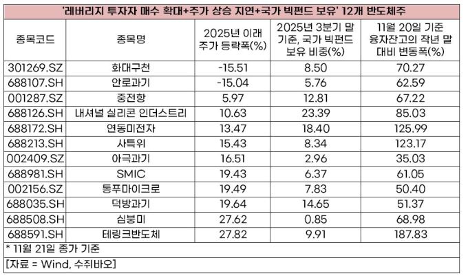 구체적인 선별 기준은 △중국 국가 차원의 반도체 산업 육성 펀드인 '국가반도체 산업투자펀드(國家大基金∙CICF∙국가 빅펀드)'가 10대 유통주주 명단에 이름을 올린 반도체 종목 △레버리지(대출) 투자자의 매수 규모가 확대되며 융자 잔고가 지난해 말 대비 크게 늘어난 반도체 종목 △연내 주가 흐름이 반도체 산업지수 섹터의 상승률을 밑도는 상대적으로 주가 상승세가 지연되고 있는 반도체 종목의 세 가지다.