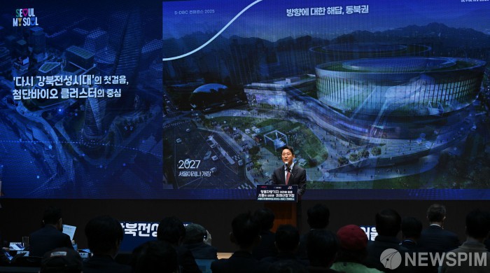 [서울=뉴스핌] 양윤모 기자 =오세훈 서울시장이 24일 시청본관 다목적홀에서 열린 ‘서울디지털바이오시티(S-DBC) 컨퍼런스’에서 개회사를 하고 있다. 2025.11.24 yym58@newspim.com