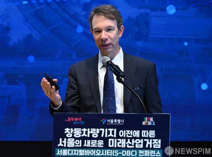 [서울=뉴스핌] 양윤모 기자 = 요하네스 프루에하우프 바이오랩스 CEO가 24일 서울시청 다목적홀에서 열린 ‘서울디지털바이오시티(S-DBC) 컨퍼런스’에서 기조강연을 하고 있다. 2025.11.24 yym58@newspim.com