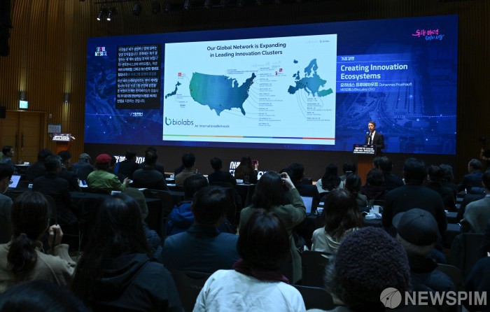 [서울=뉴스핌] 양윤모 기자 = 요하네스 프루에하우프 바이오랩스 CEO가 24일 서울시청 다목적홀에서 열린 ‘서울디지털바이오시티(S-DBC) 컨퍼런스’에서 기조강연을 하고 있다. 2025.11.24 yym58@newspim.com