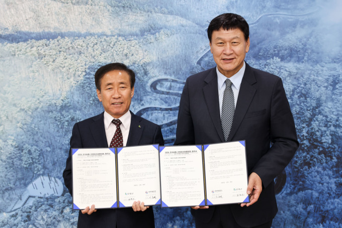 김문근 단양군수와 이준희 대한씨름협회장이 단양장사 싸름대회 유치협약을 맺었다.[사진=단양군] 2025.11.25 choys2299@newspim.com