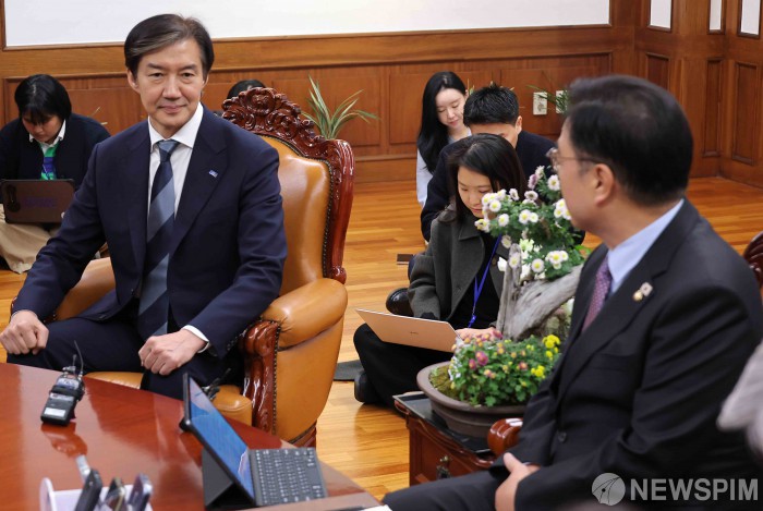 [서울=뉴스핌] 윤창빈 기자 = 조국 조국혁신당 대표가 25일 서울 여의도 국회에서 당대표 취임 인사 차 우원식 국회의장을 예방한 가운데 발언을 경청하고 있다. 2025.11.25 pangbin@newspim.com