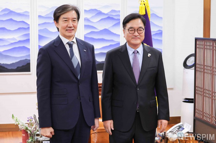 [서울=뉴스핌] 윤창빈 기자 = 우원식 국회의장이 25일 서울 여의도 국회에서 당대표 취임 인사 차 예방한 조국 조국혁신당 대표와 기념촬영을 하고 있다.2025.11.25 pangbin@newspim.com