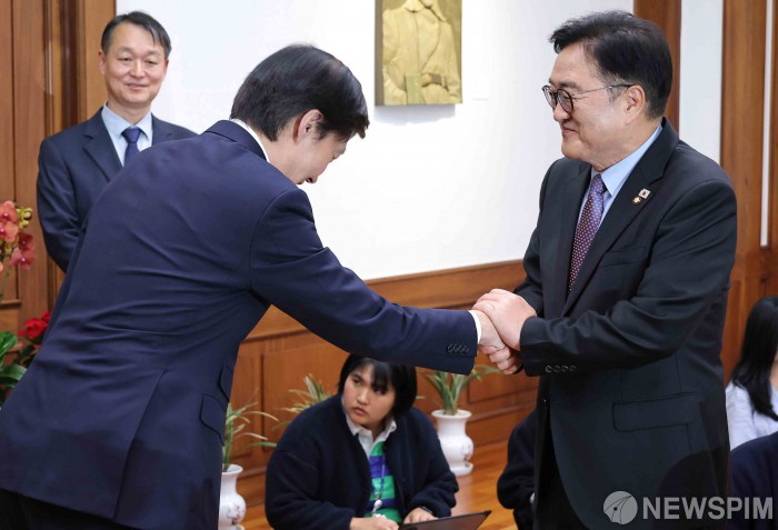 [서울=뉴스핌] 윤창빈 기자 = 우원식 국회의장이 25일 서울 여의도 국회에서 당대표 취임 인사 차 예방한 조국 조국혁신당 대표를 맞이하고 있다.2025.11.25 pangbin@newspim.com