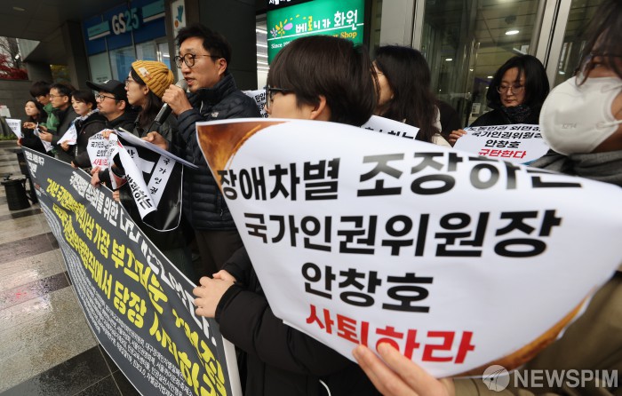[서울=뉴스핌] 김학선 기자 = 국가인권위원회 바로잡기 공동행동이 25일 서울 중구 국가인권위원회 앞에서 안창호 사퇴 촉구 범시민사회 기자회견을 열고 있다. 2025.11.25 yooksa@newspim.com