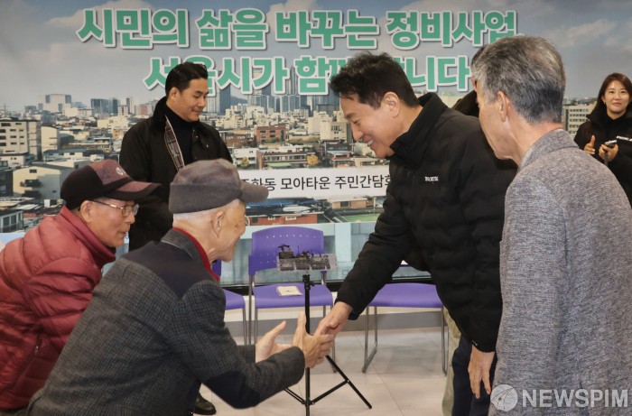 [서울=뉴스핌] 양윤모 기자 = 오세훈 서울시장이 25일 오전 서울 중랑구 중화동 중화마중마을활력소에서 329-38번지 일대 중화동 모아타운 현장 주민간담회에서 참석자들과 악수 하고 있다. 중랑구 중화동 일대 모아타운은 4개 사업지에서 총 2295가구(임대 453가구)가 공급되며 사업지는 세입자가 이사할 때 이주비 등을 지원하고 용적률을 추가로 확보하는 ‘세입자 손실보상’ 제도가 적용된다. 2025.11.25 yym58@newspim.com