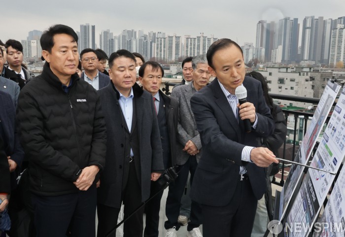 [서울=뉴스핌] 양윤모 기자 = 오세훈 서울시장이 25일 오전 서울 중랑구 중화동 중화마중마을활력소 옥상에서 329-38번지 일대 중화동 모아타운 사업추진현황을 브리핑 받고 있다. 중랑구 중화동 일대 모아타운은 4개 사업지에서 총 2295가구(임대 453가구)가 공급되며 사업지는 세입자가 이사할 때 이주비 등을 지원하고 용적률을 추가로 확보하는 ‘세입자 손실보상’ 제도가 적용된다. 2025.11.25 yym58@newspim.com