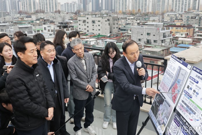 [서울=뉴스핌] 양윤모 기자 = 오세훈 서울시장이 25일 오전 서울 중랑구 중화동 중화마중마을활력소 옥상에서 329-38번지 일대 중화동 모아타운 사업추진현황을 브리핑 받고 있다. 중랑구 중화동 일대 모아타운은 4개 사업지에서 총 2295가구(임대 453가구)가 공급되며 사업지는 세입자가 이사할 때 이주비 등을 지원하고 용적률을 추가로 확보하는 ‘세입자 손실보상’ 제도가 적용된다. 2025.11.25 yym58@newspim.com
