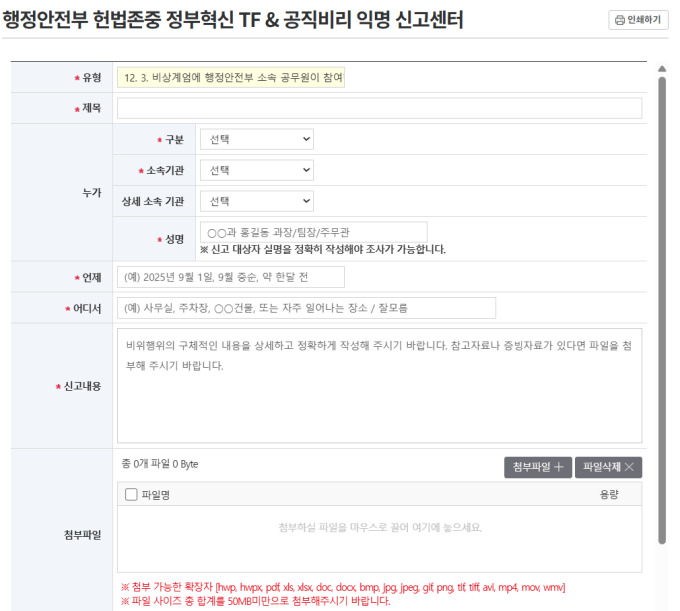 | 행정안전부 홈페이지 내 헌법존중TF 제보 접수 양식 [자료=행정안전부] 2025.11.25 sheep@newspim.com |