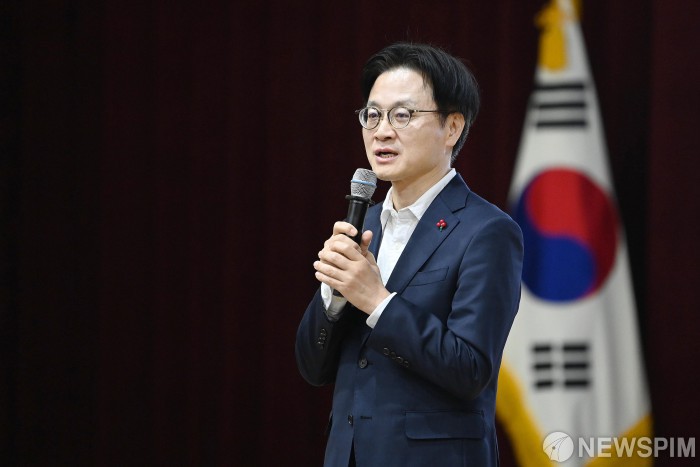 [서울=뉴스핌] = 김정관 산업통상부 장관이 25일 정부세종청사 12동 대강당에서 산업부 본부 및 소속기관 직원이 참석한 가운데 열린 산업통상부 타운홀미팅에서 인사말을 하고 있다. [사진=산업통상부] 2025.11.25 photo@newspim.com