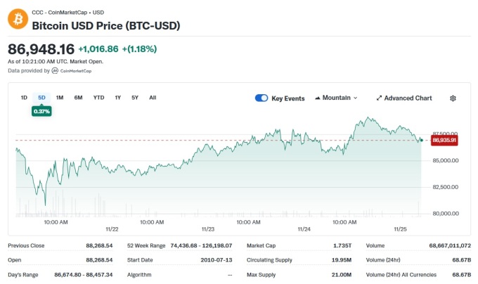 한국 시간 25일 오후 7시 15분 기준 비트코인(BTC) 가격은 24시간 전에 비해 1.04% 오른 8만6995달러, 이더리움(ETH) 가격은 2.9% 상승한 2882달러에 각각 거래되고 있다. XRP는 6.4%, BNB는 0.9%, 솔라나(SOL)는 5.1% 각각 오르는 등 알트코인도 대체로 반등 흐름이다.