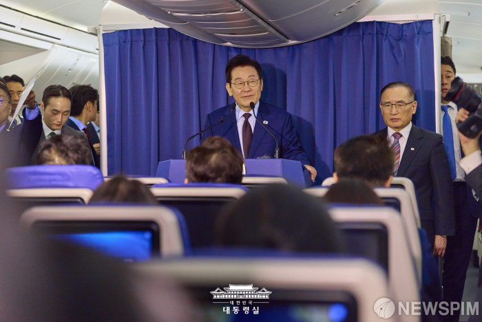 [서울=뉴스핌] 이재명 대통령이 지난 23일(현지시간) 튀르키예 앙카라로 향하는 공군 1호기에서 기내 기자간담회를 열고 있다. [사진=대통령실] 2025.11.26 photo@newspim.com