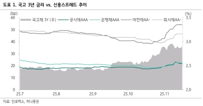 하나증권은 그러나 안심하기에는 이르다고 경계했다. 크레딧 시장은 통상 국채금리 움직임에 한발 늦게 반응하는 특성이 있어, 오히려 국채금리 변동성이 줄어드는 시점이 신용채권 투자자에겐 경계해야 할 구간이 될 수 있다는 지적이다. 연말 은행권 자금조달 병목은 일종의 '리허설'에 불과하고, 내년에도 비슷한 수급 충격이 반복될 가능성을 열어둬야 한다는 것이다.​