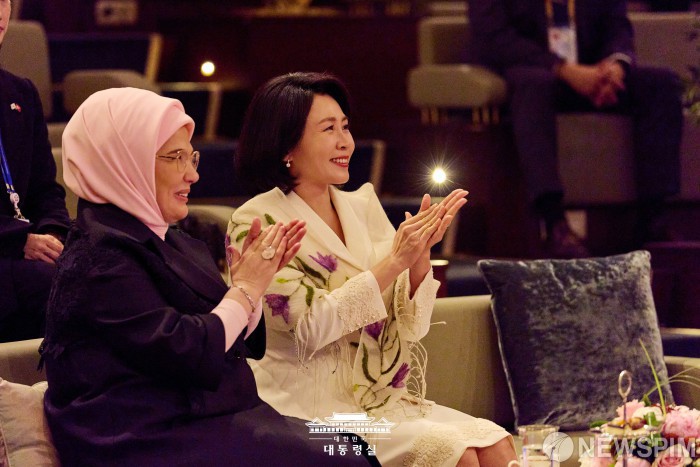 [서울=뉴스핌] 김혜경 여사가 지난 24일(현지시간) 튀르키예 대통령 부인 에미네 에르도안 여사와 앙카라의 국민 도서관에서 문화 공연을 관람하고 있다. [사진=대통령실] 2025.11.26 photo@newspim.com