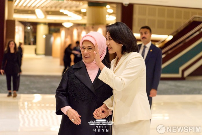 [서울=뉴스핌] 김혜경 여사가 지난 24일(현지시간) 튀르키예 대통령 부인 에미네 에르도안 여사와 친교의 시간을 보내고 있다. [사진=대통령실] 2025.11.26 photo@newspim.com