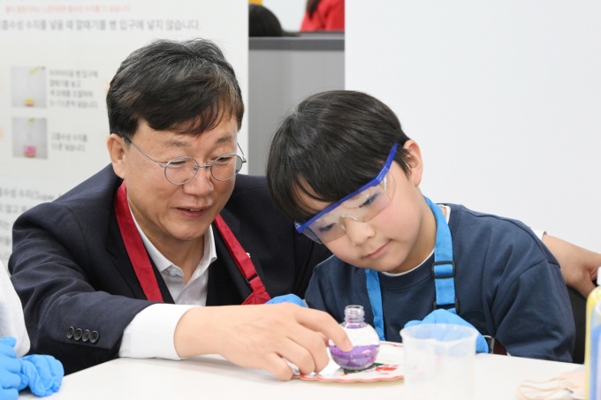 | 이민근 안산시장(왼쪽)이 25일 한국바스프㈜ 안산공장에서 진행된 '어린이 화학실험교실 키즈랩(Kid's Lab)' 프로그램에 참여한 어린이와 함께 과학실험을 진행하고 있다. |