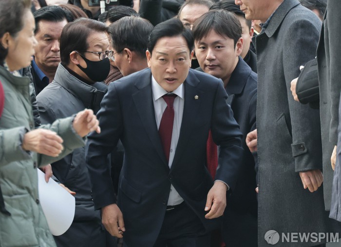 [서울=뉴스핌] 양윤모 기자 = 김선교 국민의힘 의원이 26일 오전 김건희 여사 일가의 '양평 공흥지구 개발 특혜 의혹'의 피의자 신분으로 서울 종로구 KT광화문빌딩 웨스트에 마련된 김건희 특검팀(특별검사 민중기)에 출석하고 있다. 김선교 의원은 김 여사의 모친 최은순씨와 오빠 김진우씨가 연루된 아파트 개발부담금 회피로 '특정범죄 가중처벌법상 국고손실 혐의'를 받고 있다. 2025.11.26 yym58@newspim.com